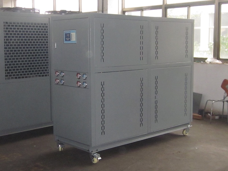 電鍍行業用電鍍冷水機組: 種類電鍍液冷卻,使金屬、非金屬分子穩定.冷水機使金屬分子隨著穩定的電流快速貼附上鍍件表面,增加鍍件的密度和平滑,縮短電鍍周期,提高質量,并可有效地回收化學物質,工業制冷設備同理也適用于真空鍍膜工業 。A.直接冷卻:即鍍液直接通過過濾機或是過濾網進入冷凍機的蒸發器進行降溫再回到氧化槽。此冷卻方式的優缺點:冷卻時間短、效果好;缺點就是蒸發器需要做防腐處理(一般采用鈦合金),蒸發器里容易結垢,需定期清洗,否則影響制冷效果和機器運行。B.間接冷卻:氧化槽里鋪置鈦管,冷凍水通過鈦管帶走渡液熱量達到降溫目的;若鋪鈦管不便可添一換熱器(需是鈦合金制成)一邊走冷凍水一邊走鍍液。